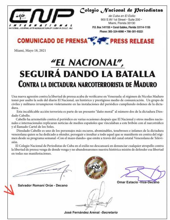 «Una nueva agresión contra la libertad de prensa acaba de verificarse en Venezuela: el régimen de Nicolás Maduro tomó por asalto la sede del diario El Nacional, un histórico y prestigioso medio de comunicación. Un grupo de civiles y militares irrumpieron violetamente en las instalaciones del periódico cumpliendo órdenes de la dictadura», dice un comunicado emitido desde la ciudad de Miami con fecha del 18 de mayo.