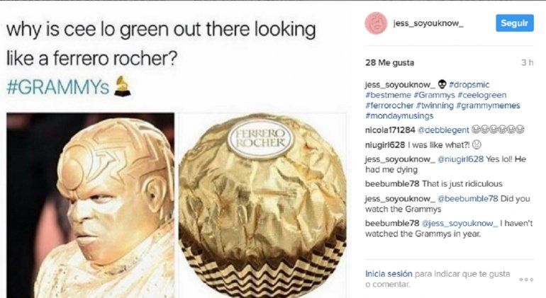 La gala de los Grammy 2017 trajo varias sorpesas que no pasaron desapercibidas ante aquellas personas que con ingenio crearon divertidos memes donde se muestra cada episodio que marcó el gran evento. Los memes más graciosos fueron los que hacían referencia al peinado y vestuario de los artistas.