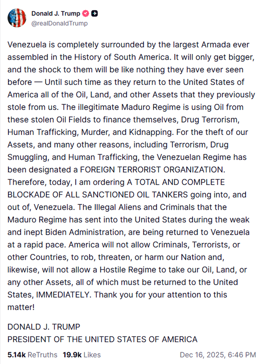 "Hoy ordeno un bloqueo total y completo de todos los petroleros sancionados que entren y salgan de Venezuela", escribió Trump en su plataforma Truth Social, días después de que fuerzas estadounidenses incautaran un petrolero frente a la costa venezolana.