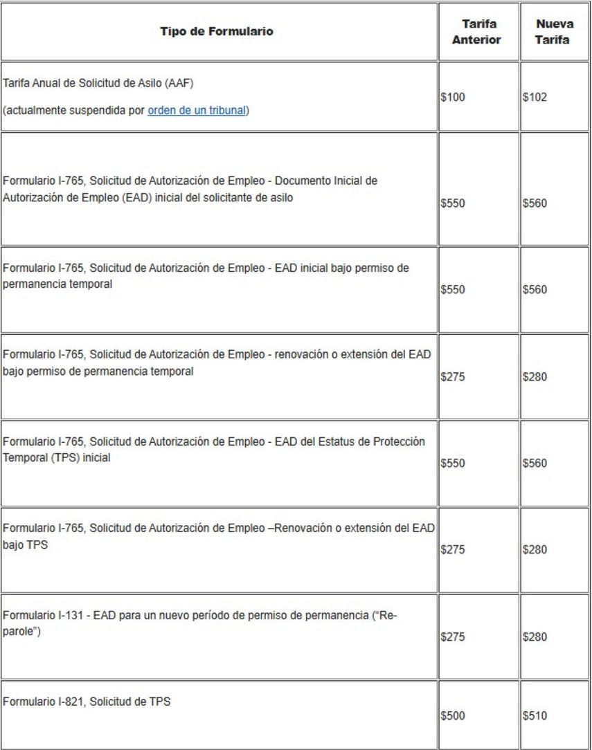 USCIS publicó en su portal web una tabla detallada con las tarifas que aumentan y las que permanecen sin cambios.