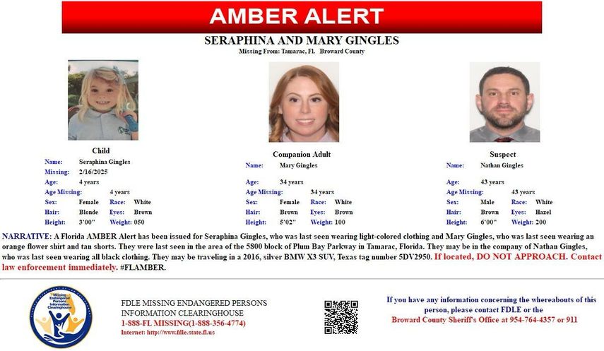 Las autoridades del condado de Broward emitieron la mañana del domingo una alerta AMBER por la desaparición de Seraphine Gingles, una menor de 4 años, que la policía anunció que està en situación de peligro y que se encuentra en poder de Nathan Gingles, que aparentemente es un familiar.